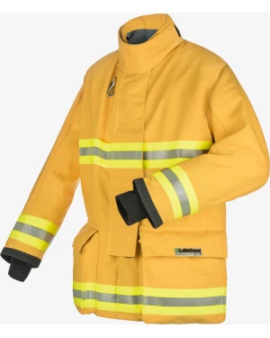Lakeland fire suits offer advanced thermal protection with durable, lightweight materials designed for firefighter safety and comfort. The Attack™ suit features a Nomex IIIA outer shell with moisture barrier and thermal liner, providing a Total Heat Loss (THL) of 215, and durable reinforcements for enhanced wear resistance. It includes ergonomic design elements such as pleated sleeves, Kevlar thumbhole wristlets, and reinforced cuffs, with reflective Scotchlite trim for high visibility.